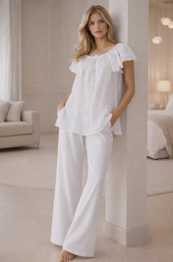 Цей комплект піжами виконаний блуза з батисту-маркізету а штани з хлопку — надзвичайно легкої та дихаючої тканини з делікатною текстурою, яка м’яко торкається шкіри.